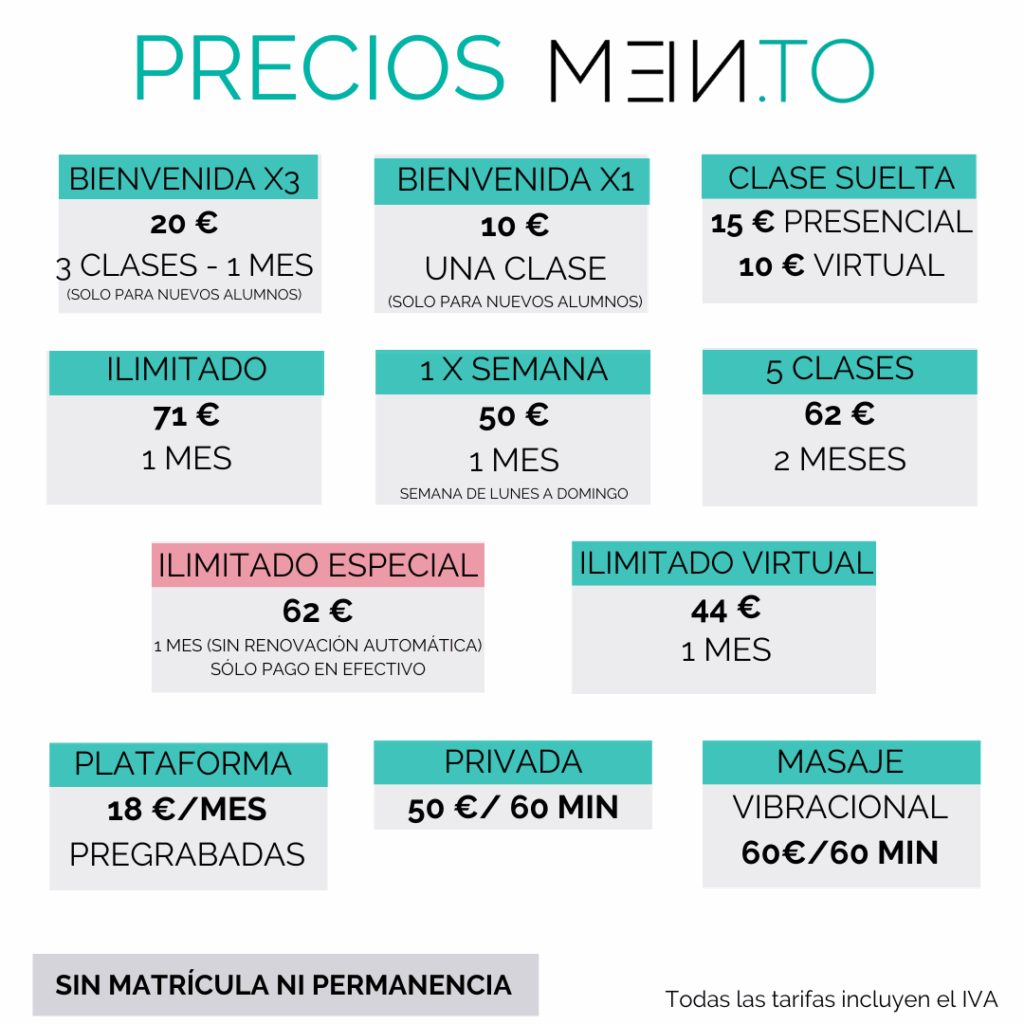 PRECIOS Inicio / PRECIOS sin matrícula, sin permanencia - elige tu frecuencia de práctica conoce nuestros bonos Somos un espacio que es dinámico y profundamente curativo, acogedor e inclusivo Acompáñanos a hacer de este mundo un mejor vividero!